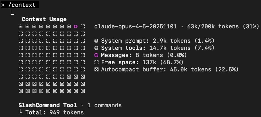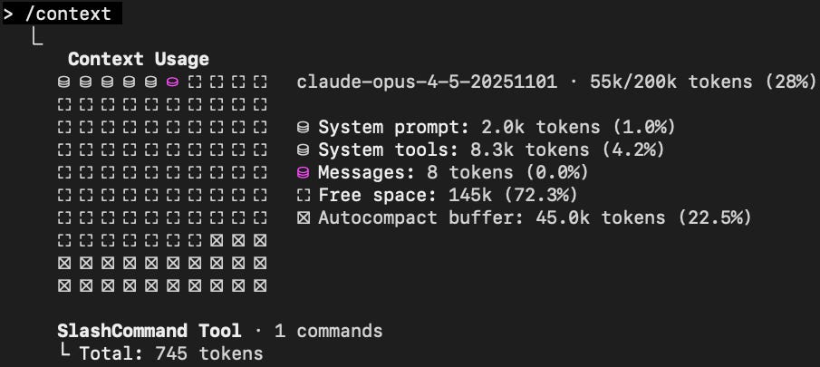 There’s a /compact command in Claude Code that summarizes your conversation to free up context space. Automatic compaction also happens when the full available context is filled. The total available context window for Opus 4.5 is currently 200k, and 45k of that is reserved for automatic compaction. About 10% of the total 200k is automatically filled with the system prompt, tools, memory, and dynamic context. But I found that it’s better to proactively do it and manually tune it. I turned off auto-compact with /config so I have more context available for the main conversation and more control over when and how compaction happens.