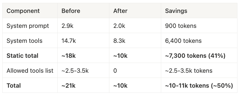 Claude Code’s system prompt and tool definitions take up about 18k tokens (~9% of your 200k context) before you even start working. I created a patch system that reduces this to about 10k tokens - saving around 7,300 tokens (41% of the static overhead, ~50% of the overall overhead).
