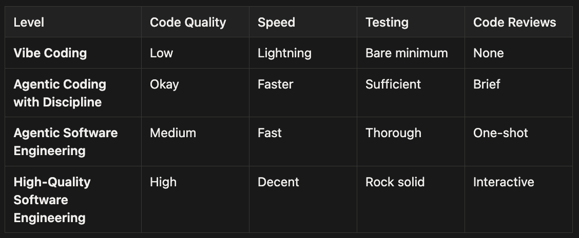 Sometimes staying at the vibe coding level is fine - quick prototypes, one-off scripts, experiments. Sometimes you need high-quality software engineering - medical software, large-scale systems, other mission-critical software.